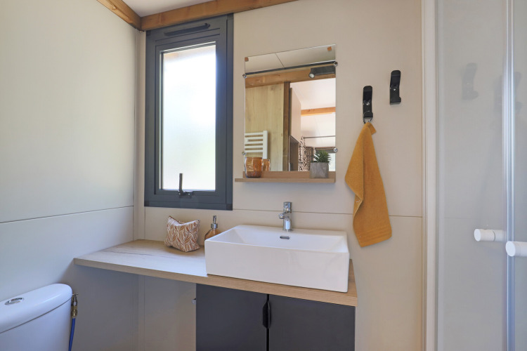 Dentro, encontrarás una acogedora zona de estar con cómodos asientos y una mesa de comedor, perfecta para noches de juegos o un suntuoso desayuno. La cocina, totalmente equipada, dispone de cocina de gas, frigorífico y todos los utensilios que necesitas para cocinarte. Así podrás disfrutar del aire libre sin renunciar a la comodidad.