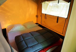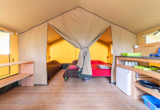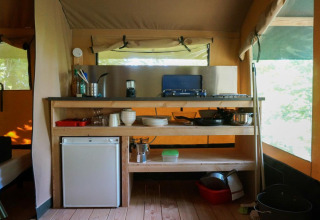 La Baroudeur Tent consta de dos dormitorios, una sala de estar con una pequeña zona de cocina (estufa, nevera y utensilios de cocina). En el lugar encontrarás una pequeña lámpara de camping para la iluminación diaria.