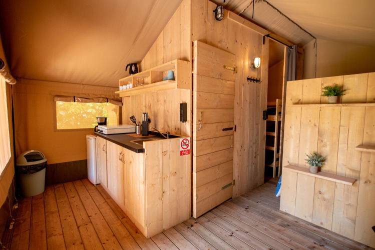 La tienda safari con instalaciones sanitarias es una tienda safari de lujo con capacidad para 4 personas, ¡un alojamiento ideal para unas vacaciones en familia o en grupo! Con una superficie de 25m2. Comed juntos en la gran mesa con sillas, abrid completamente la parte delantera de la tienda y disfrutad de las vistas y del aire fresco. Prepara las comidas en la cocina totalmente equipada y relájate al final del día en uno de los lujosos sillones o en uno de los 2 dormitorios. En un dormitorio encontrarás una gran cama doble, y en el otro una litera. Con 2 metros de largo, las camas son adecuadas tanto para niños como para adultos. Para que tus vacaciones de glamping sean aún más lujosas, la tienda safari está equipada con un cuarto de baño completo con ducha, inodoro y lavabo.