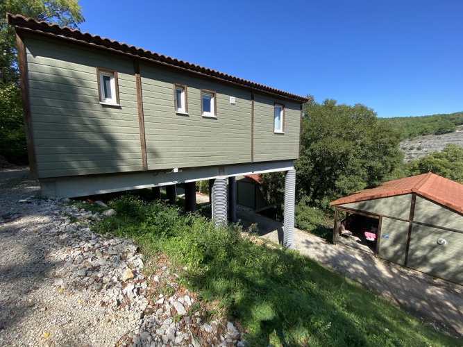 En la terraza cubierta tienes una hermosa vista del paisaje natural de colinas. Un lugar ideal para empezar el día con un desayuno francés. O qué tal largas sobremesas bajo el cálido sol del verano. Este chalet tiene dos dormitorios, uno con cama de matrimonio y otro con una cama individual y una litera. Hay otro sofá cama en la zona de estar, lo que facilita la creación de una sexta litera. Hay un cuarto de baño con ducha y lavabo y un retrete separado.