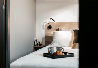 • Tienda de campaña junto a un lago rodeada de frondosos árboles en el parque vacacional Huttopia Senonches.