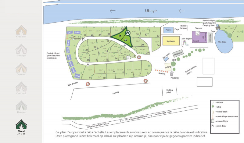 El camping está situado junto al río, donde también hay una pequeña playa de arena.
