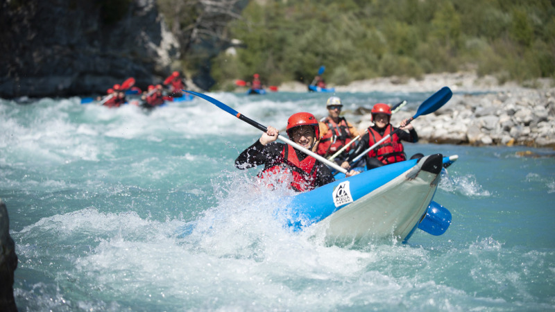 Personas haciendo rafting en un río cerca de Prunières, Provence-Alpes-Côte d’Azur, con chalecos salvavidas.