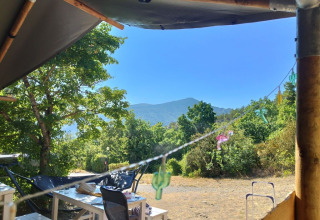En la terraza puedes relajarte en dos sofás lounge o en la hamaca. En la parcela también hay una mesa de comedor de madera con bancos y dos sillas de camping reclinables. La tienda no tiene baño privado; se utilizan las instalaciones sanitarias del camping. Gracias a la espaciosa terraza y las instalaciones al aire libre, la vida al aire libre es el centro de atención aquí.
