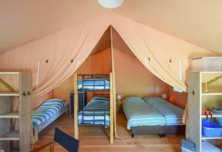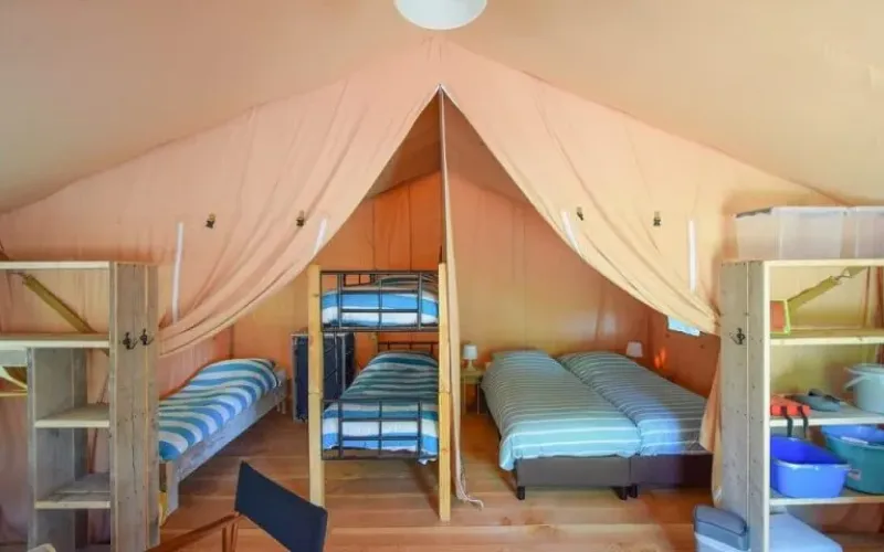 Esta robusta tienda safari está situada sobre una plataforma de madera y ofrece una cómoda experiencia de glamping. En el interior, encontrarás una amplia zona de estar con mesa de comedor y bancos, y dos áreas de dormitorio. Los padres duermen en colchones boxspring cómodos y en el segundo dormitorio hay una litera y una cama individual. Se incluyen almohadas, edredones y ropa de cama. Dentro de la tienda hay una cocina con inventario completo, una nevera grande con congelador y una cafetera Nespresso. Para cocinar, hay una cocina exterior móvil con una estufa de gas de 4 fuegos.