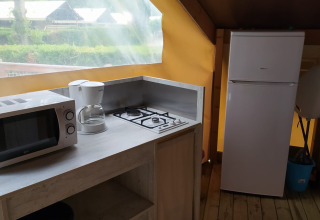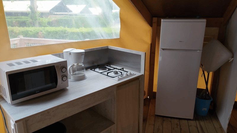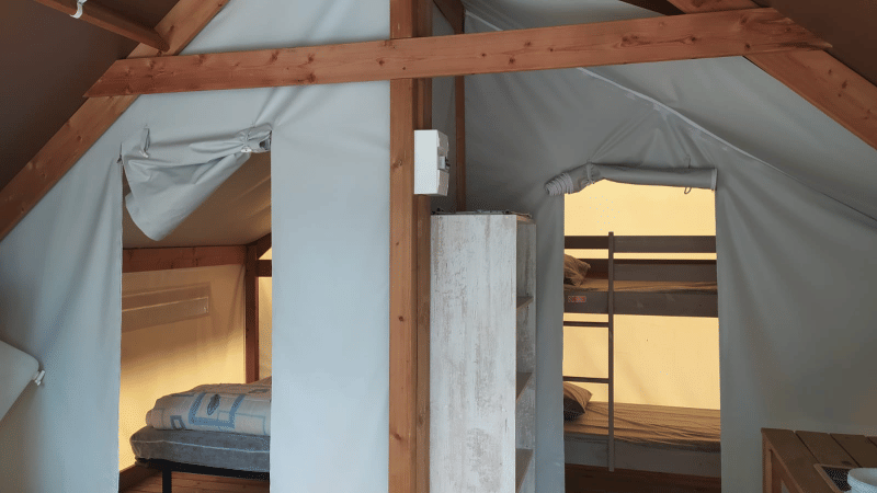 Vive la experiencia al aire libre en una ecolodge elevada de 21 m², ideal para cuatro personas. Disfruta de dos dormitorios separados y una acogedora zona de comedor que se conecta perfectamente con una terraza parcialmente cubierta. Esta nueva generación de tiendas tipo lodge está diseñada para vivir cerca de la naturaleza sin renunciar a la comodidad. El espacio es luminoso, abierto y decorado con ambiente, perfecto para quienes disfrutan cocinar al aire libre y comer juntos. No hay instalaciones sanitarias presentes, lo que conserva el encanto del campamento tradicional. Para los amantes de los animales, se permite un perro pequeño. Esta ecolodge combina la sencillez con una experiencia de glamping única, en un entorno animado donde la relajación y la aventura se encuentran.