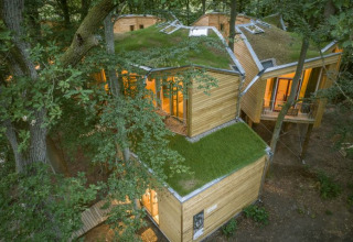 Las suites de la casa del árbol están ingeniosamente dispuestas: un dormitorio con una cómoda cama doble, un salón con sofá y mesa, dos literas, un amplio balcón y un espacioso cuarto de baño accesible. Las suites están adaptadas para sillas de ruedas y también son accesibles en ascensor. Incluso en las zonas pequeñas, las cabañas BIO en los árboles ofrecen mucho espacio: un sofá, una pequeña mesa de trabajo y una acogedora bañera con ducha. Algunas cabañas pequeñas tienen balcones franceses o miradores ocultos. Por la noche, duerme bajo la claraboya y disfruta de la vista del dosel y las estrellas.