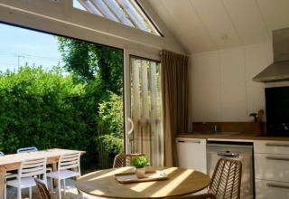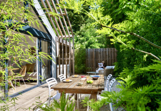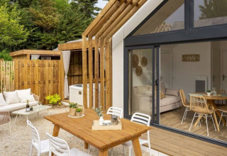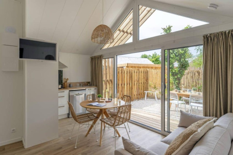 Experimenta la paz y el lujo en una Villa Spa Bois Marin, un alojamiento ecológico de madera con capacidad para 5 personas. La villa dispone de dos dormitorios con una cama grande y dos camas individuales, además de una cama supletoria en el salón. La cocina, totalmente equipada, tiene un frigorífico grande, lavavajillas y microondas. Relájate bajo la ducha italiana o en el spa privado de la terraza de 50 m², con patio y pérgola para disfrutar de la máxima intimidad. El luminoso interior de 35 m² ofrece una cómoda sala de estar y una zona de comedor, mientras que el espacio exterior invita a comer, tomar aperitivos y relajarse sin interrupciones. Ideal para parejas, familias o amigos que quieran combinar comodidad y naturaleza.