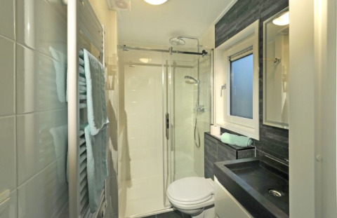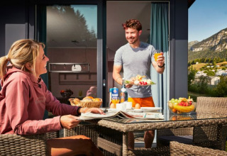 El amplio equipamiento no deja nada que desear: sofá moderno, mesa grande con sillas, TV de pantalla plana, iluminación ambiental, y una cocina totalmente equipada con placa de gas de 4 fuegos, frigorífico-congelador, lavavajillas, horno microondas combinado, cafetera y hervidor de agua. En el exterior, la zona de estar con sofá y mesa te invita a relajarte. Ten en cuenta que los Chalets Panorama sólo se pueden reservar por semanas en temporada alta y que debes llevar toallas de playa.