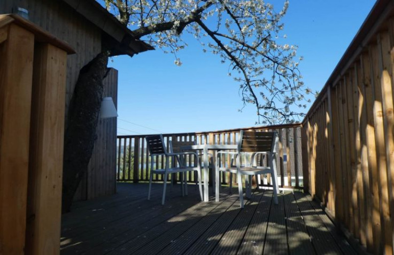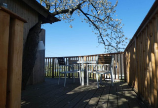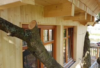 La casa está construida dentro y alrededor de un viejo cerezo, sin estresarlo: se alza sobre pilotes, está construida con un armazón de madera y descansa sobre cimientos atornillados para proteger las raíces del árbol. Se accede a la casa del árbol por una cómoda y amplia escalera. Dentro, encontrarás muebles modernos y de alta calidad.