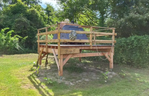 En esta plataforma decorada de verde, escucha los sonidos de los 5 Grandes de la selva: elefante, rinoceronte, búfalo, león y leopardo te esperan aquí y disfruta de una noche especial juntos en el Dachzelt Dorf.
