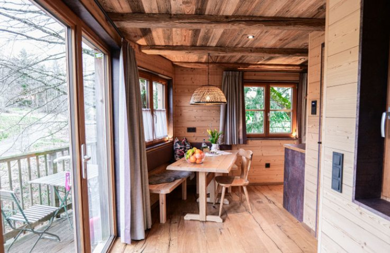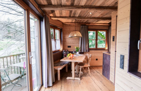 Las lujosas casas del árbol Weitblick y Zeitraum ofrecen unos 32 m² de espacio confortable para hasta 4 personas. El interior está totalmente amueblado con madera local y con muebles de madera reciclada y paneles claros, creando un ambiente cálido y natural. La casa del árbol tiene dos dormitorios separados con camas dobles, uno en la planta baja y otro en la primera planta. El salón incluye una acogedora zona de comedor y una pequeña cocina con frigorífico y lavavajillas. El cuarto de baño tiene ducha y WC. Un gran porche y una terraza en la azotea ofrecen horas de relax a gran altura, acompañados por el canto de los grillos y el canto de los pájaros. Hay aparcamiento a unos 70 metros, por lo que no te molestará el ruido del tráfico. Las casas del árbol funcionan con energía solar autogenerada respetuosa con el medio ambiente. Si lo solicitas, te pueden llevar directamente a tu alojamiento un desayuno con productos regionales en una cesta de picnic.