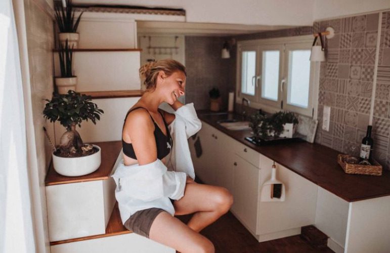 Dentro, encontrarás una cocina totalmente equipada con frigorífico, placa y horno, así como un moderno cuarto de baño con ducha, lavadora y secadora. Duerme en el acogedor altillo con una amplia cama, mientras que la zona de estar del salón se puede convertir fácilmente en una cama supletoria.