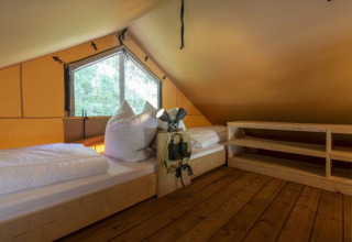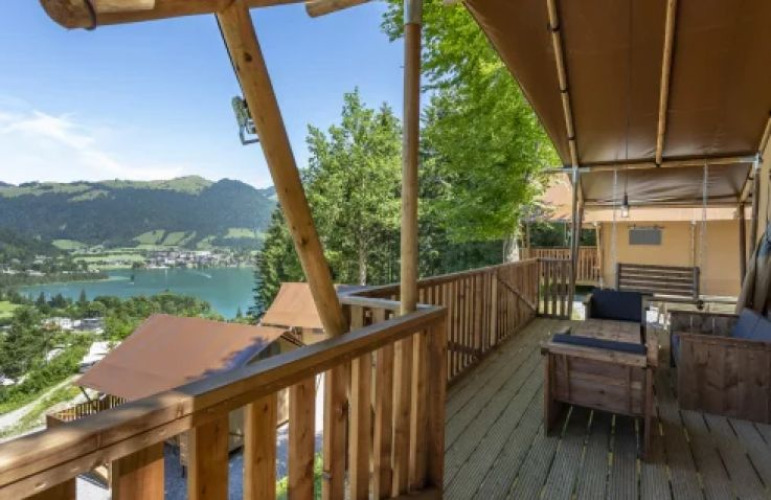 Experimenta el glamping de primera clase: las tiendas de lujo situadas en lo alto de Walchsee ofrecen impresionantes vistas de las montañas y combinan la aventura de acampar con el verdadero confort de vivir. Cada tienda está altamente equipada con 3 camas individuales, 1 cama doble, ducha y WC, cocina, frigorífico, lavavajillas y aire acondicionado para calefacción y refrigeración. En la veranda, disfruta del panorama y de las vistas del lago y la montaña desde cómodos sillones.
