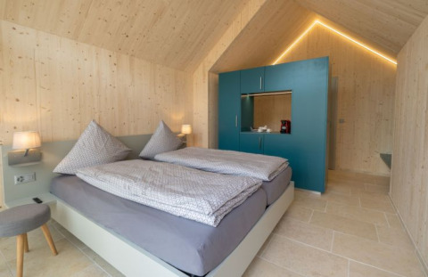 Extra al reservar: uso exclusivo de la bañera de hidromasaje en el Badhüüsli para 2 personas (con cargo extra). La elegante cabaña de bienestar al pie de los viñedos ofrece la relajación perfecta después de paseos o excursiones. Opcionalmente, también puedes reservar el Paquete Fin de Semana de Bienestar, que incluye una noche en el Räbhüüsli, una hora de uso del Badhüsli, una botella de vino espumoso casero junto a la piscina y un desayuno regional de viticultor.