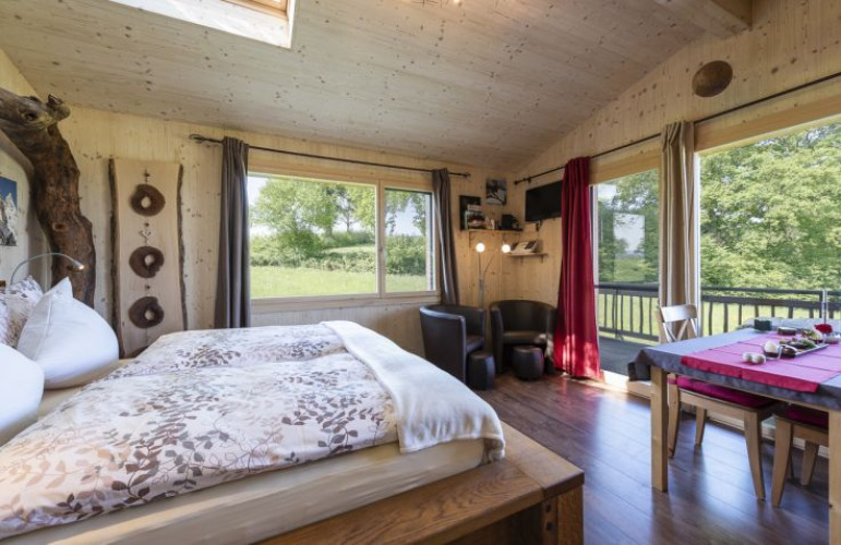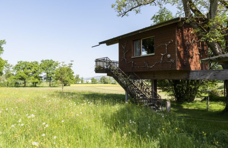 La Wurzelbaumhaus está decorada con esmero en 20 m² y se alza tres metros sobre el suelo. El exclusivo interior y la calefacción por suelo radiante a base de virutas de madera crean un ambiente acogedor. Al mismo tiempo, se concede gran importancia a la sostenibilidad: la casa del árbol se calienta con astillas de madera de su propio bosque, el agua potable procede de su propio pozo o de aguas subterráneas, y las aguas residuales se reciclan como valioso abono en los prados circundantes. El mobiliario incluye una cama de madera maciza y un cuarto de baño con ducha e inodoro. Un balcón con muebles de salón ofrece magníficas vistas del lago de Sempach y de la verde naturaleza. Los productos utilizados para el desayuno proceden de la granja, de la región o de calidad ecológica. El pan se entrega fresco por la mañana mediante una cesta elevadora. Se puede llegar a pie a un restaurante típico suizo y a otro italiano en 15 minutos. Además, es posible disfrutar de una vista exclusiva de la agricultura de la granja.