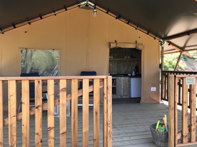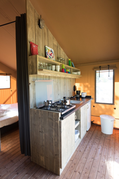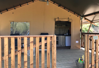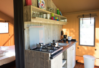 Relájate en una tienda safari acogedora donde el confort y la vida al aire libre se unen. En el interior hay cuatro plazas para dormir distribuidas en dos áreas: dos camas boxspring (80 x 200 cm) y una litera (80/90 x 200 cm), ambas equipadas con mosquitera. Las camas están hechas a la llegada, por lo que la estancia comienza directamente con relajación. Una cocina totalmente equipada con cocina de 4 fuegos, nevera con congelador y agua corriente fría y caliente hace que cocinar sea sencillo. También cuenta con un baño privado para mayor comodidad. En el interior encontrarás un comedor acogedor con banco y sillas, mientras que en la amplia veranda, dos sillas reclinables invitan a disfrutar de la vida al aire libre. Hay electricidad y utensilios para seis personas. Niños adicionales pueden alojarse en una pequeña tienda junto a la tienda principal.
