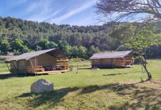 Experimenta el equilibrio perfecto entre encanto rústico al aire libre y comodidad premium en la robusta Greencamp Safari Tent. Construida sobre una plataforma de madera elevada, esta lujosa tienda de alquiler para cinco personas ofrece una amplia sala de estar, dos dormitorios separados y una gran terraza para relajarse. El punto destacado de este alojamiento es el baño privado situado justo al lado de tu tienda, brindándote comodidad sanitaria exclusiva mientras se mantiene el máximo espacio habitable en el interior. La tienda está bellamente amueblada con colchones box-spring de alta calidad, sofás lounge acogedores y una cocina exterior móvil para cocinar al aire libre.
