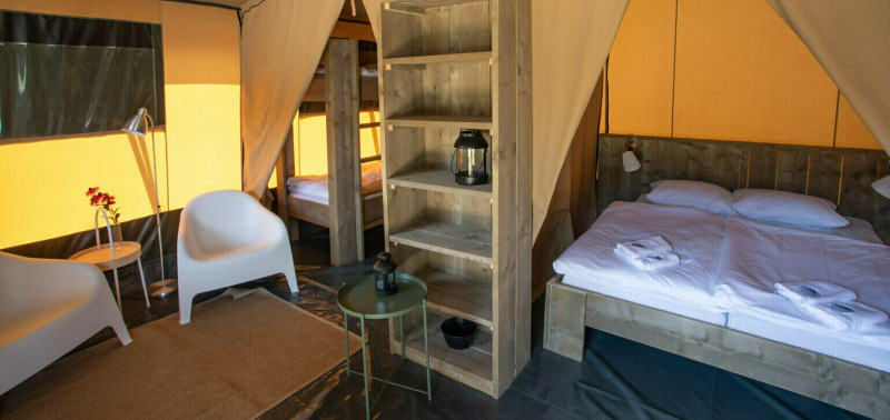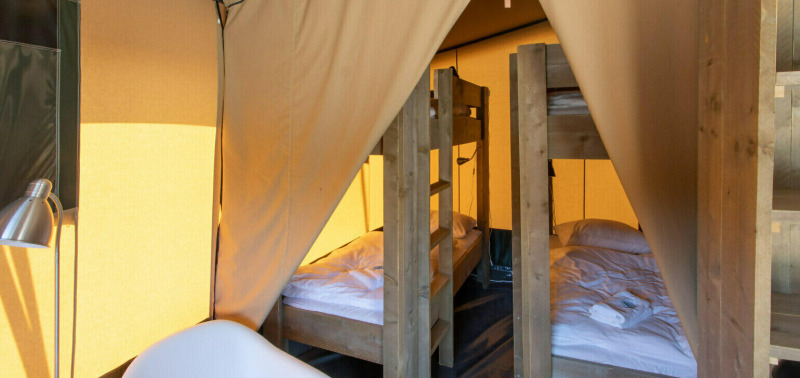 Bienvenido a este acogedor Alojamiento Base, perfecto para 2 a 6 personas. Disfruta de la espaciosa tienda interior de 25 m², donde una lujosa cama doble XL y dos literas te ofrecen una cómoda noche de sueño. Sal a la terraza de 15 m² y relájate en el lujoso salón Fatboy, rodeado de un hermoso césped. La cocina exterior invita a hacer acogedoras barbacoas y deliciosas comidas bajo las estrellas. Para los amantes del café, hay una cafetera espresso y un hervidor de agua.