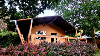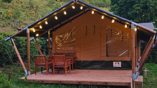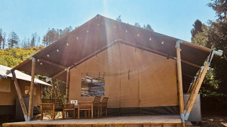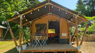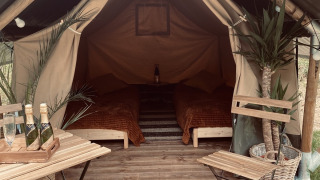 La tienda safari es una tienda safari de lujo con capacidad para 6 personas, ¡un alojamiento ideal para unas vacaciones en familia o en grupo! Con una superficie de 40m2. Comed juntos en la gran mesa con sillas, abrid completamente la parte delantera de la tienda y disfrutad de las vistas y del aire fresco. Prepara las comidas en la cocina totalmente equipada y relájate al final del día en uno de los lujosos sillones o en uno de los 2 dormitorios. En un dormitorio encontrarás una gran cama doble, y en el otro 2 literas. Con 2 metros de largo, las camas son adecuadas tanto para niños como para adultos.