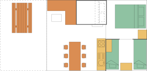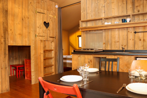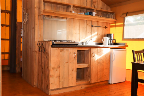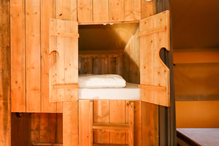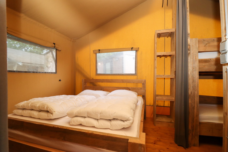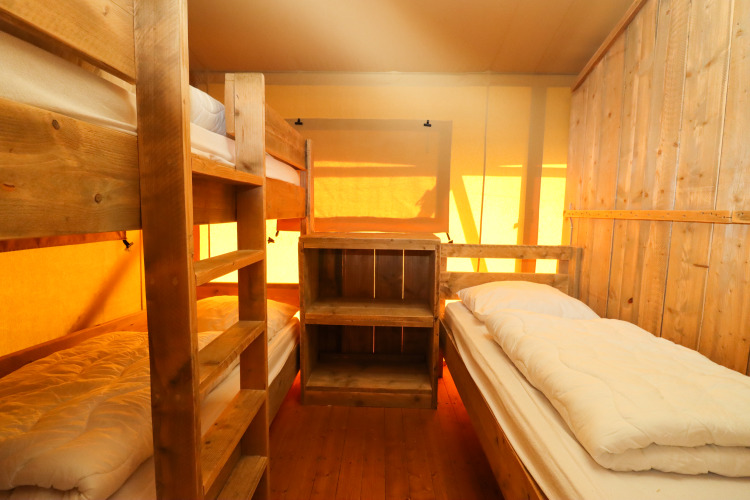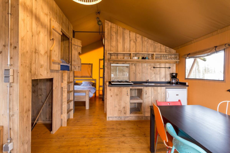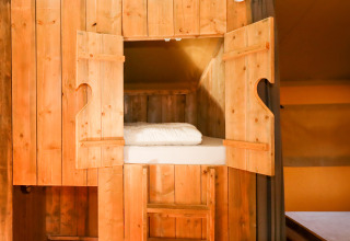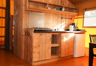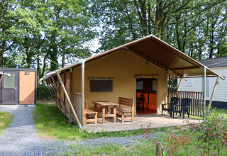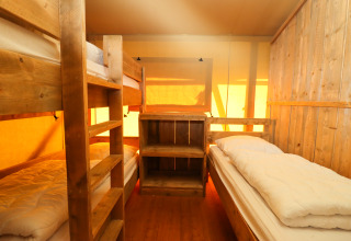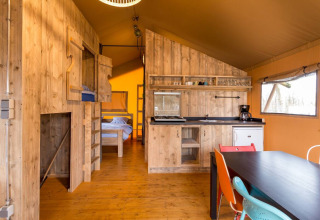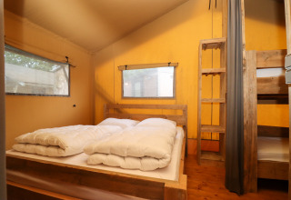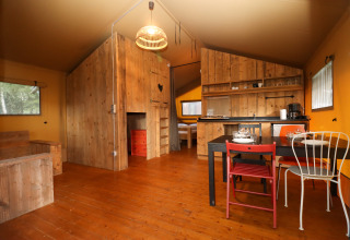 Experimenta la sensación de glamping definitiva en una de las tiendas safari decoradas con ambiente acogedor en Camping Fuussekaul. Estas amplias tiendas son adecuadas para hasta 7 personas y ofrecen todo lo necesario para unas relajantes vacaciones familiares en la naturaleza. En el interior encontrarás una cómoda zona de estar con cocina y mesa de comedor, y tres dormitorios separados: uno con cama doble, otro con litera y cama individual, y un acogedor nicho con cama doble. La tienda dispone de una terraza cubierta privada con muebles de jardín y un baño privado justo al lado de la tienda. Atención: no hay calefacción ni agua caliente en la cocina. Hay edredones y almohadas disponibles, así como una cafetera Senseo lista para tu uso. Los perros son bienvenidos por un costo adicional. No se permite fumar.
