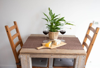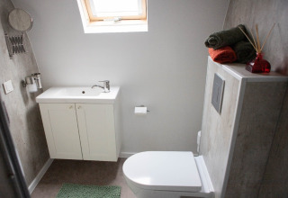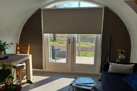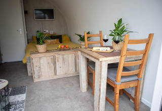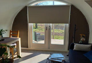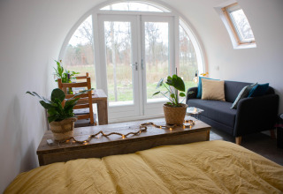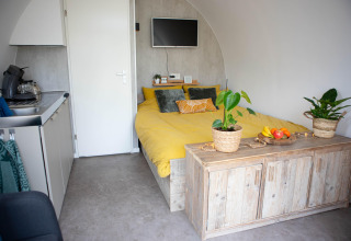 Por dentro, tu tiny house es compacta pero está inteligentemente diseñada para que se sienta luminosa y cómoda. Hay una acogedora cama doble para disfrutar de mañanas tranquilas, una kitchenette bien equipada con placa de cocina y nevera para preparar comidas sencillas, y un pequeño rincón comedor que ofrece una hermosa vista de los árboles alrededor. El baño privado cuenta con ducha y aseo, para que no tengas que compartir instalaciones. Gracias a la calefacción sostenible y un buen aislamiento, la temperatura es agradable durante todo el año: ya sea que vengas en la fresca primavera o en un fin de semana otoñal.