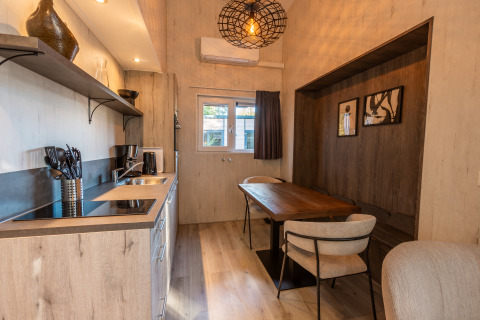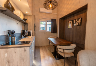 Experimenta la vida al aire libre de Drenthe en esta acogedora Tiny Borg en Ruinen. La confortable vivienda con tres dormitorios ofrece espacio para cuatro personas y combina sencillez con comodidad moderna. Comienza el día con un café de la cafetera de filtro, cocina en la placa de inducción y disfruta de una cena con vistas al entorno verde. En el interior, el aire acondicionado garantiza una temperatura agradable, mientras que la terraza con mobiliario de jardín invita a relajarse al sol. Tras un día de senderismo o ciclismo por el Parque Nacional Dwingelderveld, es agradable volver a casa al luminoso salón con televisión y wifi gratuito. Gracias a su distribución inteligente, el mobiliario completo y la ubicación tranquila, esta Tiny Borg es el lugar perfecto para desconectar y recargar energías.