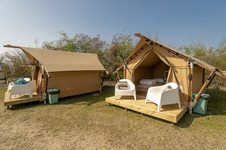 La tienda safari es una base perfecta para una estancia relajante y aventurera en la playa de Almere. Marina Parcs alquila 4 de estas tiendas safari para dos personas en un campo del puerto deportivo de Marina Muiderzand, en Almere.