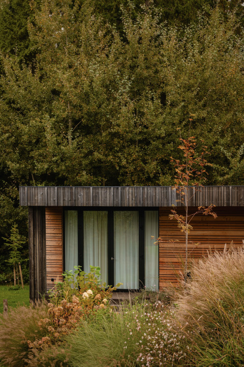 La naturaleza comienza ya en el amplio porche de 15 m2 en el lado largo. Gracias a las puertas francesas desde la sala de estar y desde el dormitorio principal, la vida al aire libre realmente se integra.