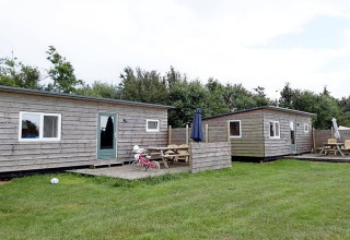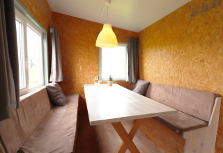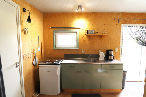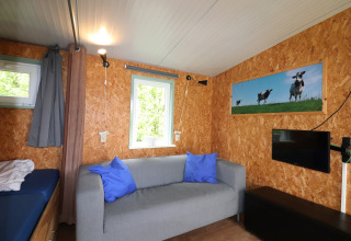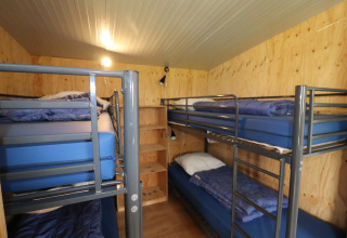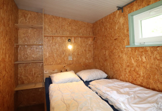 Afuera, tienes tu propia terraza donde puedes relajarte con una bebida, jugar a las cartas o disfrutar de largas noches de verano después de un día en el lago. Por dentro, la cabaña está agradablemente amueblada con un ambiente cálido y acogedor: nada demasiado lujoso, solo todo lo que realmente necesitas para una estancia sin complicaciones. Hay una unidad para dormir con una cama doble y otra con dos literas, ideal si viajas con un grupo mixto o con amigos que disfrutan de la diversión estilo campamento.