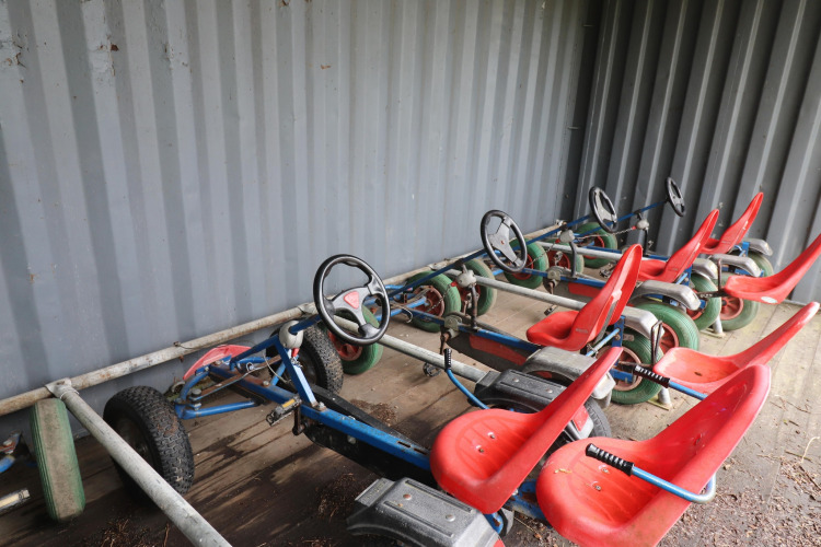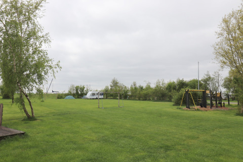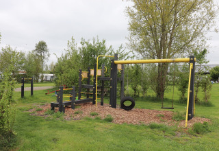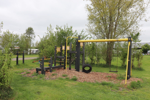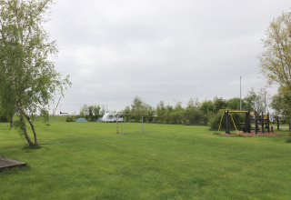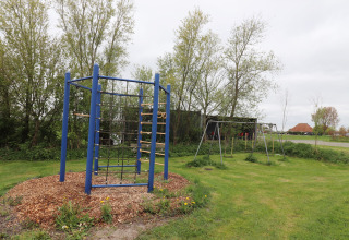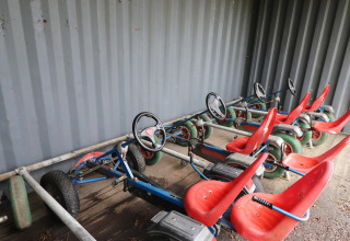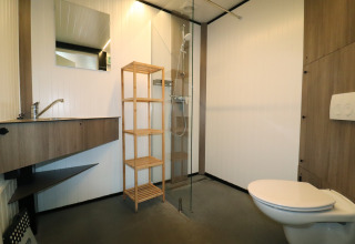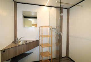 El baño es sorprendentemente espacioso, con una ducha a ras de suelo, inodoro y lavabo: perfecto para refrescarte después de nadar o de un día explorando. En el camping hay mucho por hacer: desde áreas de juegos y una zona de juego cubierta, hasta divertidos karts tipo mamut que los más jóvenes pueden conducir por el terreno. Es un lugar animado donde aún puedes encontrar tu propio espacio y tranquilidad.