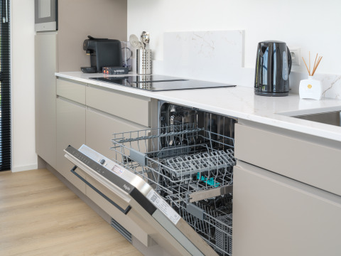 Gracias a los grandes ventanales, la vivienda de 70 m² se siente maravillosamente espaciosa y luminosa. El acogedor salón cuenta con una cómoda zona de estar con TV, una gran mesa de comedor y una moderna cocina abierta con horno combinado, lavavajillas y placa de inducción con extractor integrado. Los dos dormitorios están equipados con camas tipo box spring y cada uno dispone de su propio baño con ducha tipo lluvia. Además, hay un aseo independiente.