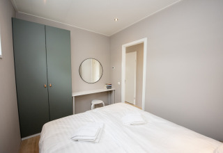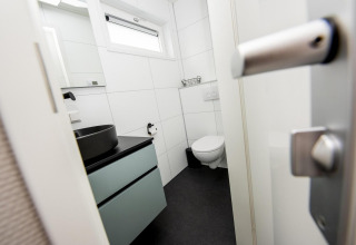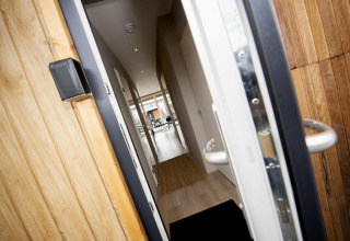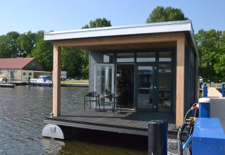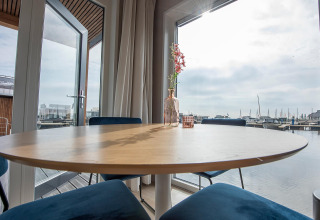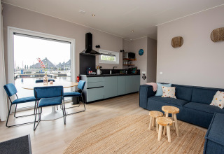 El baño moderno dispone de una ducha refrescante y accesorios contemporáneos, para que puedas enjuagarte después de un día en el agua. En la luminosa zona de estar puedes relajarte por completo. Sumérgete en el cómodo sofá con un buen libro, juega a un juego de mesa o disfruta de una cena acogedora en la mesa redonda para cuatro personas. Los grandes ventanales dejan entrar abundante luz natural y te dan esa sensación relajada de estar "en el lago" durante todo el día.