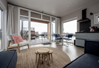 La cocina abierta está totalmente equipada para preparar comidas sencillas en casa, desayunos en la terraza o tentempiés entre actividades. Solo tienes que abrir la puerta corrediza y salir a la terraza cubierta, tu salón al aire libre extra junto al agua. Es el lugar ideal para tu primer café por la mañana, un almuerzo tranquilo o una larga velada con una copa de vino mientras el sol se pone sobre el Sneekermeer.