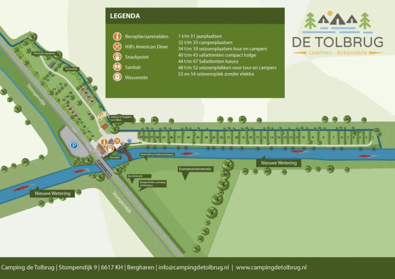 El Camping de Tolbrug está situado en el corazón de Maas y Waal. En esta hermosa ubicación, podrás disfrutar de la paz y la tranquilidad, pero también hay más que suficiente para hacer en el camping y sus alrededores. Disfruta de deliciosos platos americanos en The American Diner, o de una cerveza especial en la terraza. Hay muchas actividades al aire libre, como piragüismo, paintball o un paseo en el E-chopper. En los meses de verano, se organizan veladas musicales con bandas en directo.