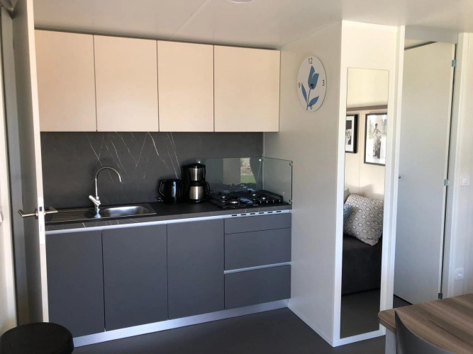 Estuvimos 5 días en un bungalow para 6 personas justo en el agua. El parque en sí es pequeño, pero está muy bien distribuido. Elegimos el parque por la anunciada playa para perros. Sin embargo, no es más que una pequeña bahía cubierta de maleza con dos tumbonas sucias. Antes hay que atravesar una zona boscosa cubierta de maleza. No queríamos pasar ni un momento allí. Por desgracia, tampoco había posibilidades de pasear en las inmediaciones. La ubicación de la casa en sí era muy agradable. Por lo demás, nos decepcionó bastante, sobre todo en cuanto al estado y la limpieza. La casa en su conjunto olía mucho a humedad, el lavavajillas apestaba, al igual que el desagüe de la ducha del cuarto de baño. Parte de la vajilla de los armarios seguía sucia. Los grandes ventanales no se habían limpiado este año. Fuera, en la terraza, se acumulaban los mechones de pelo de todos los perros que habían vivido allí antes que nosotros. La barbacoa.... Yo no habría puesto nada comestible en la barbacoa. La casa estaba helada. Los calefactores sólo funcionaban brevemente y luego a toda pastilla, después se volvía a apagar todo. La única forma de mantener la temperatura en el salón era con el fuego eléctrico. El cuarto de baño estuvo helado todo el día. No había posibilidad de colgar una toalla en el baño. Difícil si tienes toallas de ducha para 6 personas. La tienda es una habitación con dos frigoríficos y una estantería con una caja registradora para el autoescaneado. En teoría, hay panecillos para el desayuno. Si no están vacíos o sigues de pie delante de una puerta cerrada a las 10:00. En general, no recomiendo este parque.