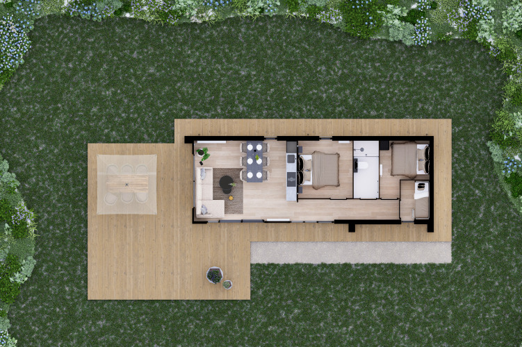 En la villa propiamente dicha, encontrarás un moderno salón con sofá, sillones, zona de comedor para 6 personas y TV de pantalla plana. Un salón encantador donde disfrutar de estar juntos. La moderna cocina está equipada con frigorífico-congelador, placa de cocción con campana extractora incorporada, horno microondas combinado, lavavajillas, hervidor de agua, cafetera Nespresso e inventario para 6 personas.
