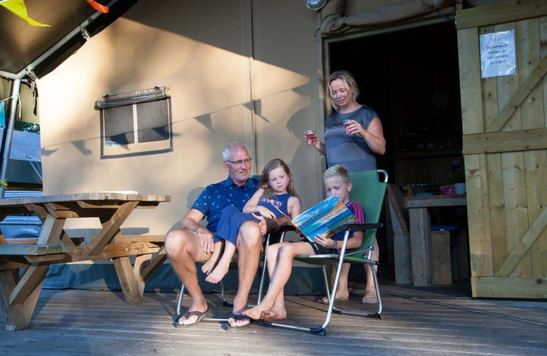 Disfruta de las largas tardes de verano en la espaciosa veranda, el lugar perfecto para una copa acogedora o una noche de juegos con la familia. O elige un lugar cómodo en el interior para jugar a las cartas: ¡hay espacio más que suficiente! ¿Y lo mejor? No hace falta que camines hasta el bloque de aseos por la noche, ya que tu propio aseo está justo dentro de la tienda.