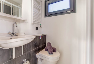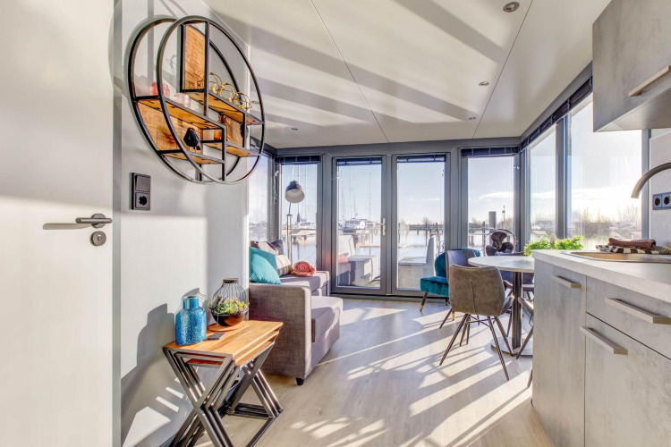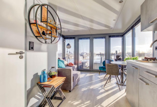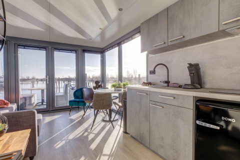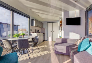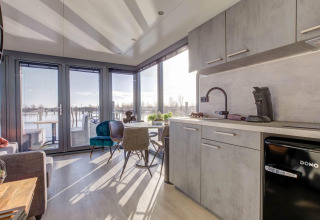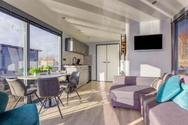 En el interior encontrarás un luminoso espacio de estar de concepto abierto con todo lo necesario para unas vacaciones relajadas. La cocina, compacta pero bien equipada, dispone de fogón, campana extractora, nevera, cafetera y hervidor eléctrico; así, podrás preparar fácilmente el desayuno, un tentempié o una cena sencilla a bordo. Junto a la cocina está la acogedora zona de comedor y sala de estar, con un cómodo rincón de asientos y televisor, ideal para mañanas tranquilas o noches relajadas después de un día explorando Volendam.