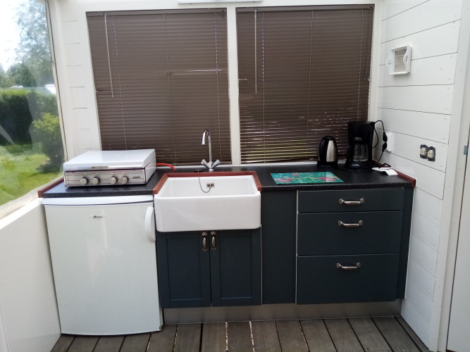 En el espacioso porche con grandes ventanales, tienes una bonita vista del campo y puedes sentarte al abrigo del viento. Aquí también encontrarás la cocina, equipada con hervidor de agua, cafetera, caldera para agua caliente, frigorífico, todos los cacharros necesarios y una cocina de gas de 4 fuegos, junto con el aseo.