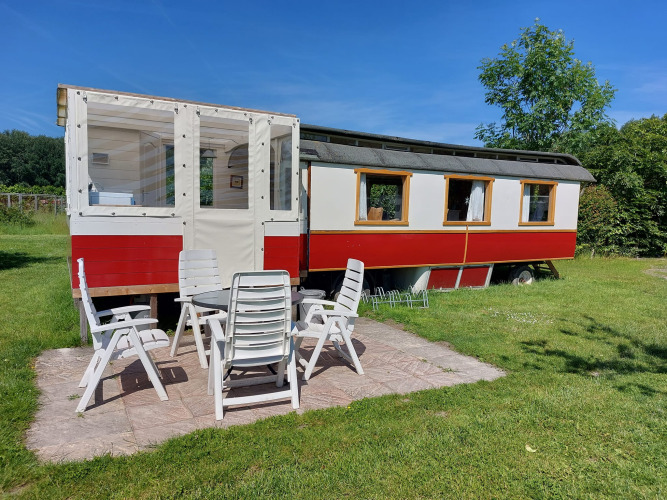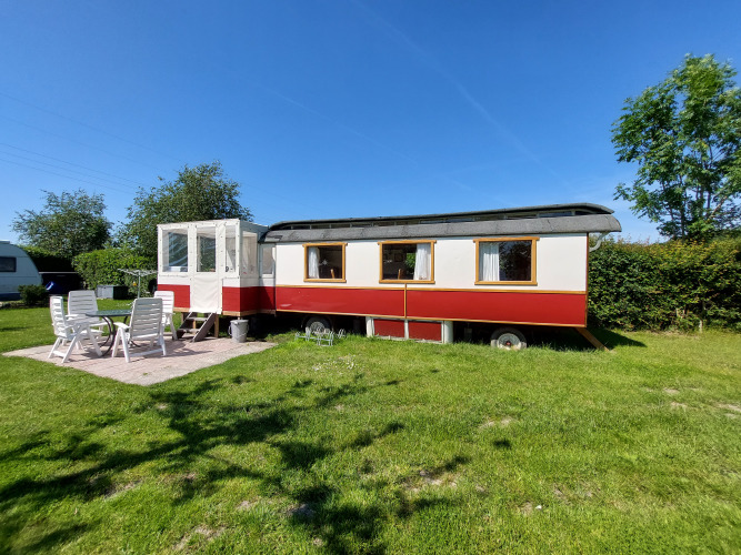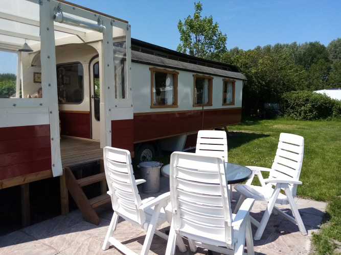 En Pipowagen Klukkluk pueden alojarse 2 personas. Este vagón gitano está en un lugar tranquilo del camping, donde hay juegos infantiles. Klukkluk tiene un bonito porche espacioso que se puede cerrar completamente, por lo que puedes sentarte aquí incluso con mal tiempo. Está equipada con calefacción eléctrica y una acogedora chimenea. Gracias a las ventanas que lo rodean, hay mucha luz natural en el interior.