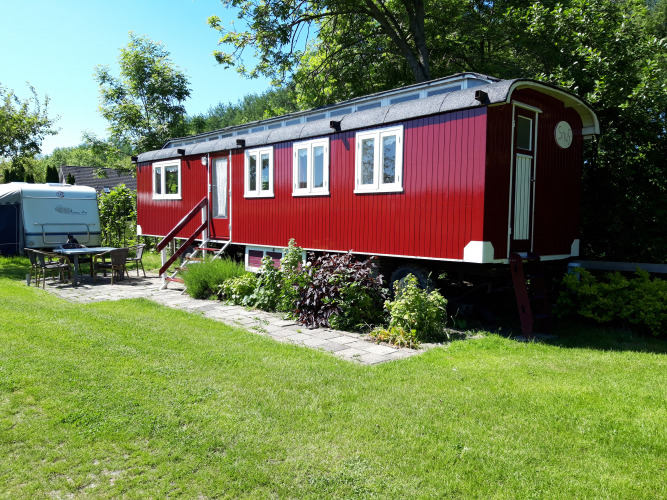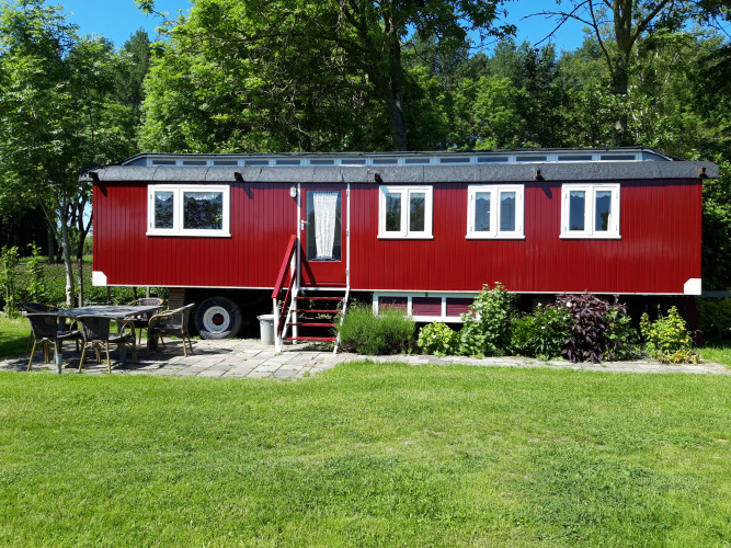 Es posible disfrutar del sol en tu propia terraza, mientras los niños juegan en el trampolín y el parque infantil o en el césped delante del vagón gitano. Si los niños son un poco mayores, pueden utilizar otros parques infantiles del camping. También hay espacio junto a la calesa para montar una tienda extra.