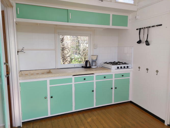 Nada más entrar, pasas a la cocina, relativamente grande. La cocina está totalmente equipada e incluye vajilla, sartenes, agua corriente fría, frigorífico, cocina de gas, cafetera y hervidor de agua.