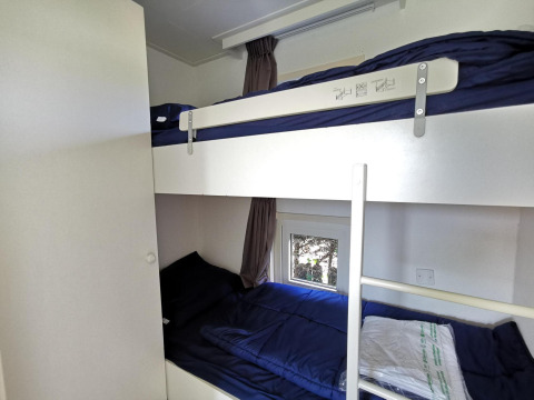 Este chalet es apto para 4 personas y tiene en total dos dormitorios: 1 dormitorio con 2 camas individuales y el segundo dormitorio cuenta con 2 camas individuales o una litera.
