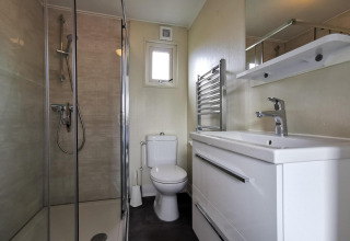 En el interior, la casa de vacaciones se completa con un moderno baño con ducha, lavabo y WC.