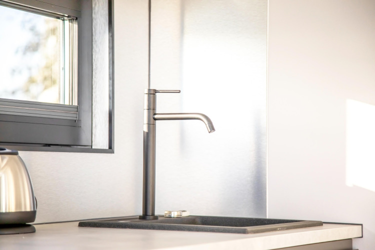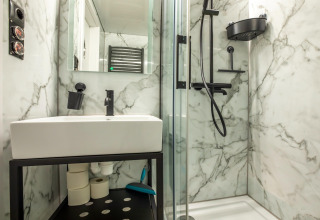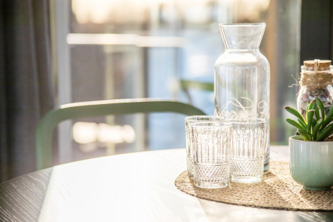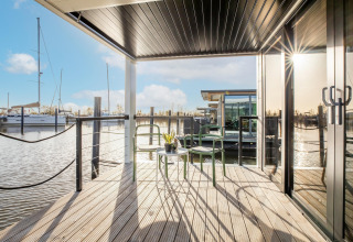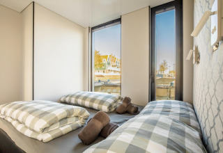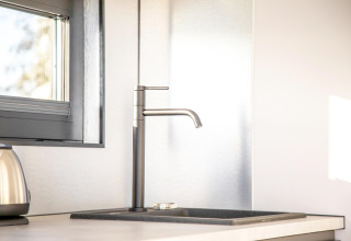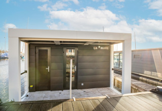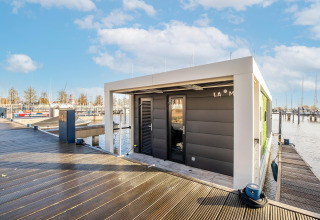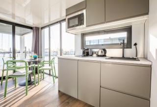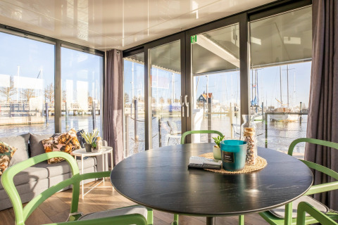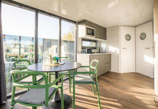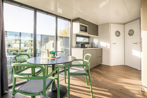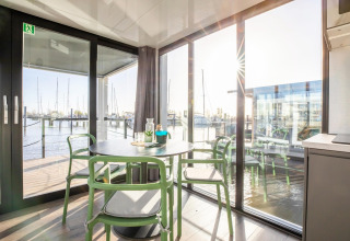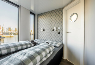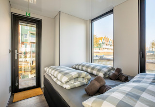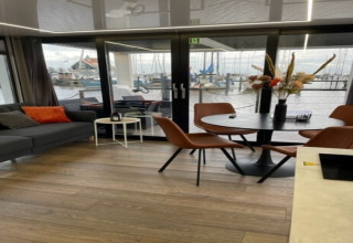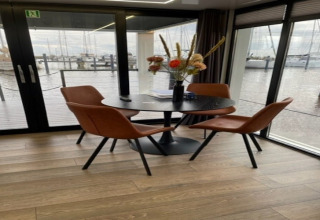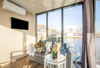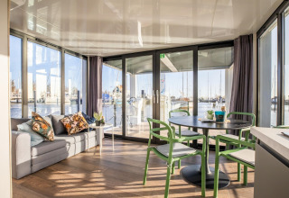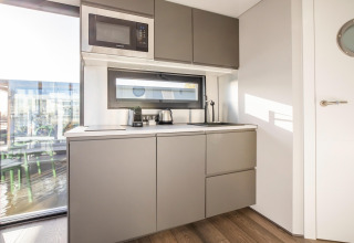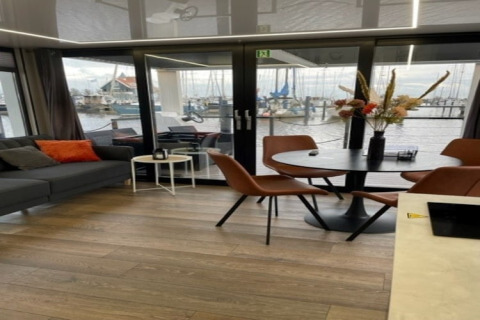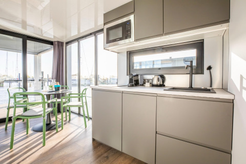 Por dentro, la casa flotante es luminosa, moderna y está inteligentemente diseñada. La cocina abierta tiene todo lo necesario para cocinar fácilmente durante las vacaciones: placa de cocina, nevera, lavavajillas, cafetera, hervidor eléctrico y campana extractora. En la zona de estar encontrarás un cómodo rincón de asientos, televisión y mesa de comedor: el lugar perfecto para mañanas tranquilas o noches relajadas en compañía. Gracias al aire acondicionado y la calefacción por suelo radiante, te sentirás cómodo en cualquier estación del año.