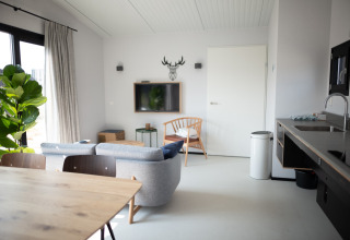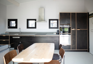 Este elegante lodge en una sola planta es luminoso y acogedor gracias a las grandes ventanas del salón. Aquí encontrarás una cómoda zona de estar con smart TV y un acogedor espacio de comedor, perfecto para desayunos largos o una noche relajada después de un día fuera. La cocina de concepto abierto está totalmente equipada con lavavajillas, microondas, cafetera Nespresso y grifo Quooker, por lo que cocinar es fácil, ya sea para preparar un aperitivo rápido o una cena completa.