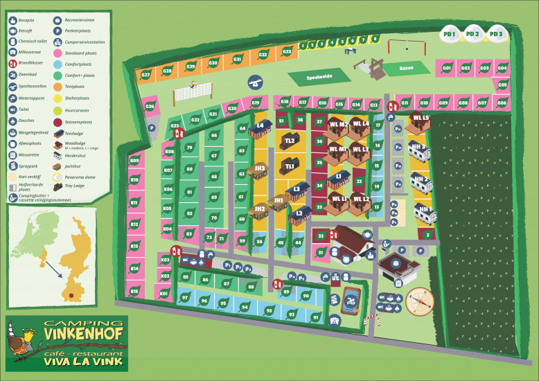El Camping Vinkenhof, en el corazón del bello Limburgo Meridional, es la base perfecta para aventurarse en excursiones a pie o en bicicleta. Descubre ciudades bulliciosas como Maastricht, Aquisgrán, Valkenburg y Lieja. Este camping es adecuado para los amantes de la naturaleza y los ciclistas deportistas, pero también para familias con niños. Los más pequeños se lo pasarán en grande: nadando, con la emoción del teleférico, columpiándose exuberantemente y manteniéndose activos en el campo de voleibol. ¡Un Valhalla lleno de oportunidades para grandes y pequeños!
