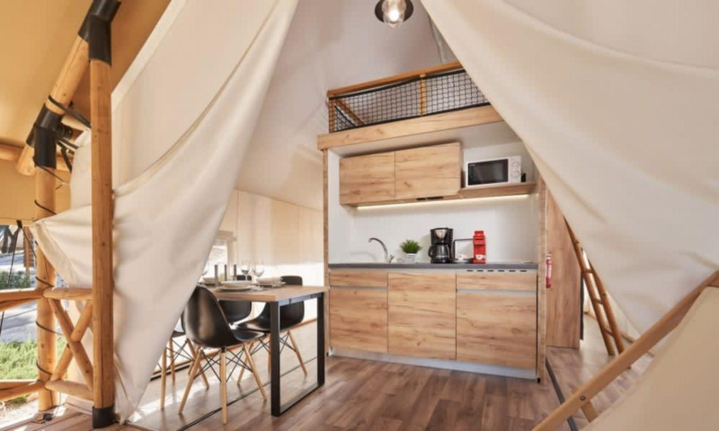 Lodge de Montagne Petite 4 es una tienda de glamping moderna y decorada con estilo que cuenta con todas las instalaciones necesarias. La tienda tiene capacidad para 4 personas y se accede a ella por unos escalones. La zona común está amueblada con un comedor y una cocina americana, que incluye una cafetera de filtro y una placa de inducción. La tienda glamping tiene en total 1 dormitorio con cama de matrimonio y otro altillo para dormir con cama de matrimonio, al que se accede por una escalera. El cuarto de baño tiene inodoro, ducha y lavabo. En el exterior encontrarás una terraza con muebles de jardín. Puedes aparcar 1 coche en la tienda y hay conexión Wi-Fi gratuita.