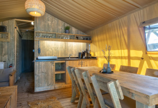 ¿Buscas un lugar divertido para hacer glamping en tu próximo viaje con amigos? Esta tienda safari totalmente amueblada en Vakantiepark Klein Vink está hecha para reuniones relajadas en la naturaleza. Con sus cálidos detalles de madera y su diseño tipo lodge, se siente acogedora desde el momento en que entras.